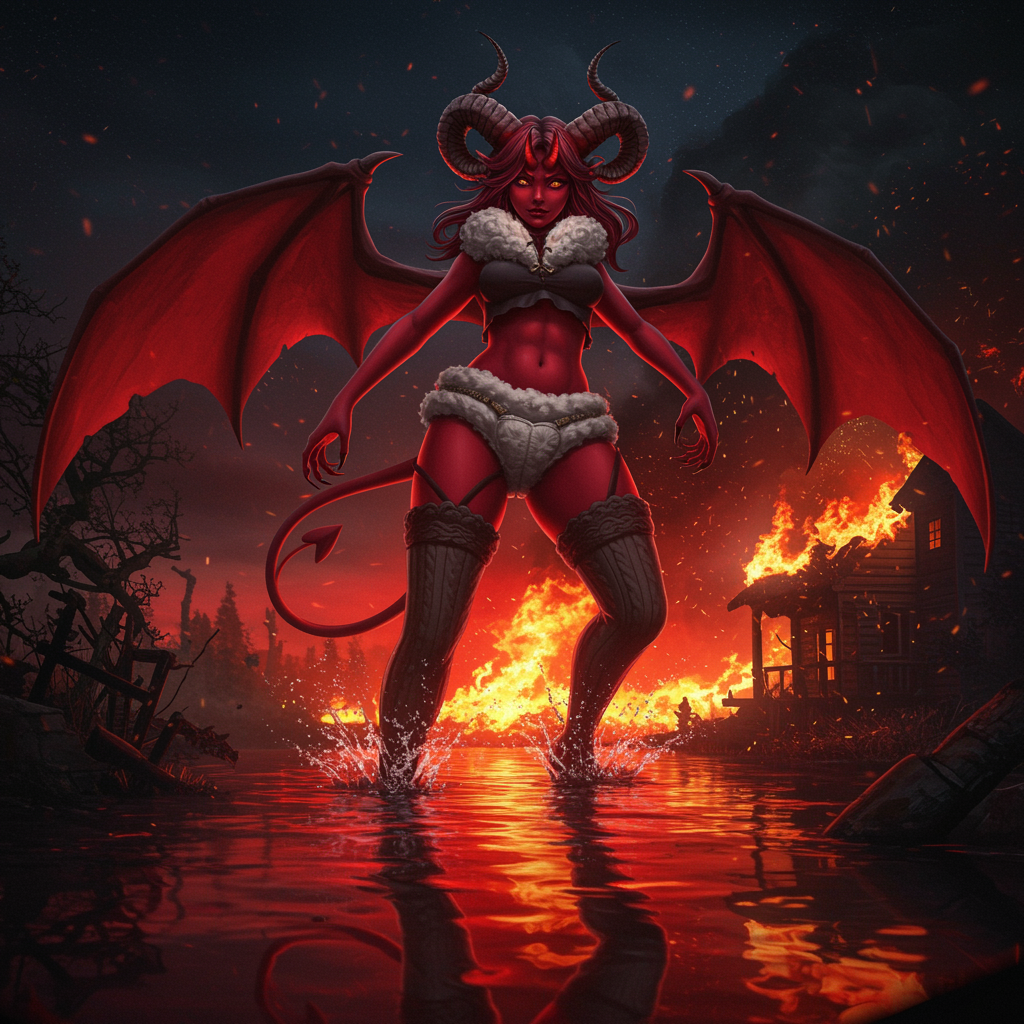 Red-skinned demon girl with wooly underpants and intricate, twisted horns, depicted in the style reminiscent of Yuumei's artistry. She wears detailed stockings, and her underpants contrast sharply with her vivid skin tone. Her figure exhibits gigantism, rendered with anime and manga graphics. The setting includes red water reflecting her presence, and demon wings loom in the background against a chaotic scene of a burning house. The composition boasts abundant small details and hyper-detail, capturing a sense of acceleration and speed with dark exposure. The overall quality is of the highest standard, with emphasis on detail and ambient lighting. The perspective is a third-person view from below, capturing her imposing figure in 8K Ultra-HD, set in the dim glow of nightlight.