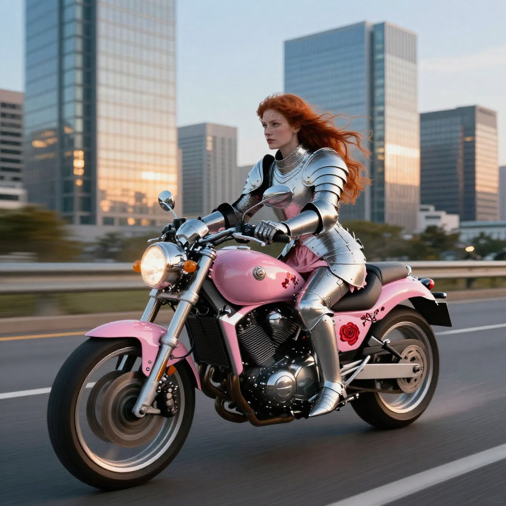 A striking image of a red-haired woman in medieval knight's armor riding a custom pink motorcycle on a multi-lane highway. Modern glass skyscrapers reflect golden hour sunlight in the background, creating a surreal and majestic atmosphere.