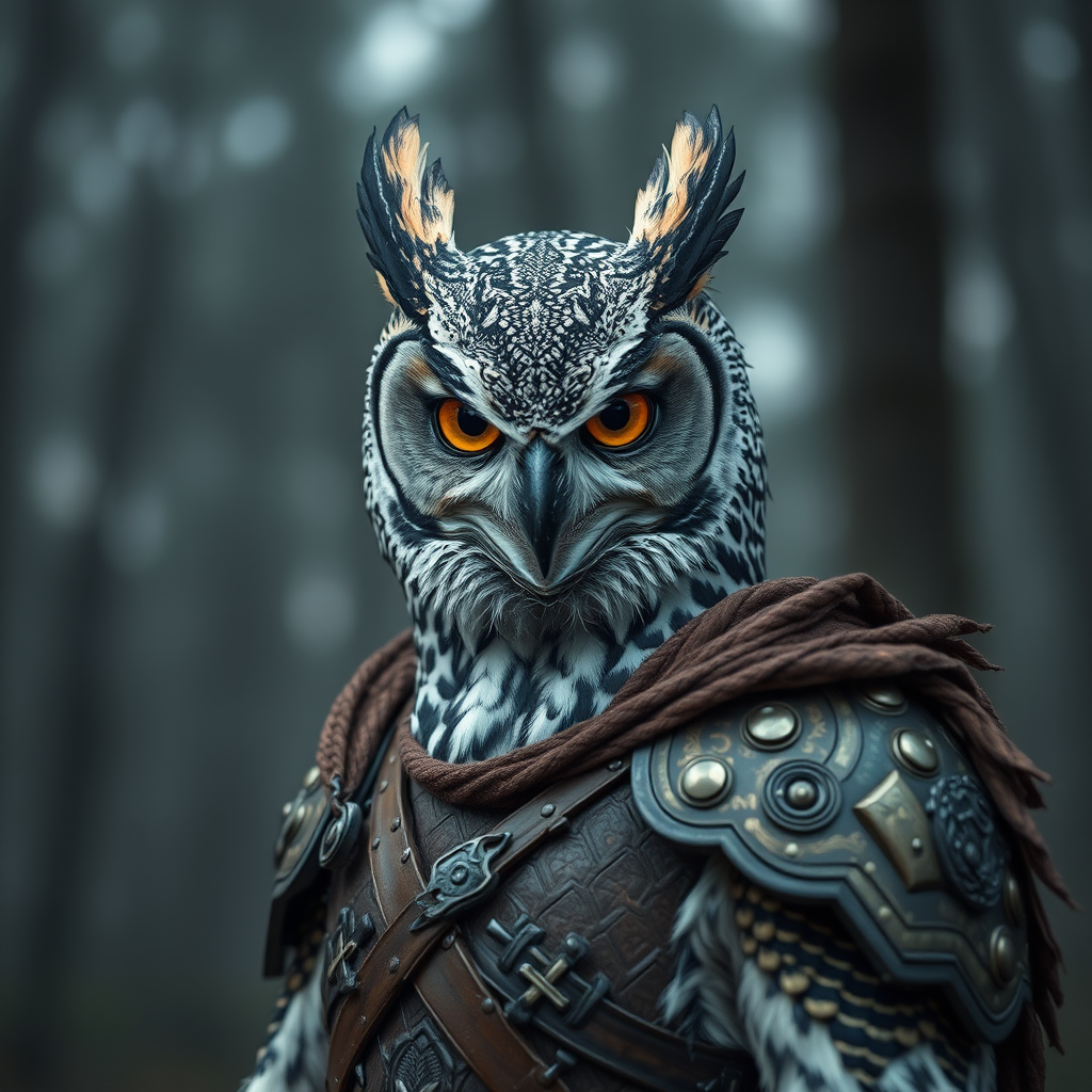 Redshift style anthropomorphic hybrid of a perfectly anatomically designed human and an ancient owl warrior, captured in a baryta fanart portrait photograph using a Hasselblad H3DII. The image is extremely detailed, showcasing intricate feather patterns and a resolute expression, characterized by sharp eyes and a proud, weathered beak. The owl warrior dons a suit of ornate armor with elegantly aged textures, standing against a backdrop of a twilight forest. The depth of field is carefully controlled to focus on the subject's face, adding vibrancy and an upbeat tone to the scene.