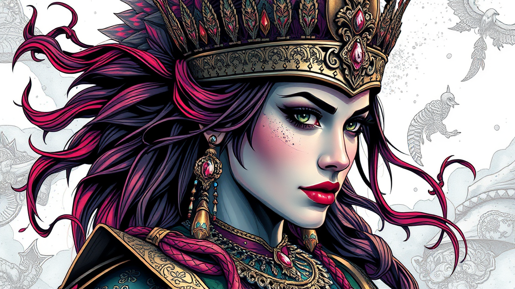 Regal warrior queen in a central pose with a key visual focus, intricately detailed with breathtaking elegance and defined linework, exuding vibrant energy and cinematic depth; inspired by the expressive styles of Carne Griffiths and Conrad Roset, this artwork embodies strength and beauty in harmonious balance.