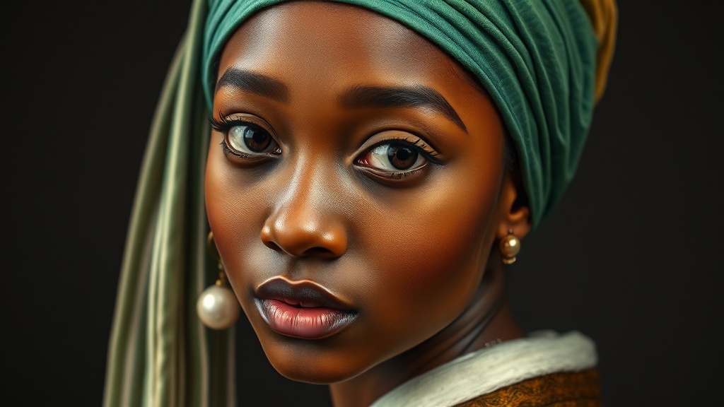 A captivating reimagining of Vermeer's "Girl with a Pearl Earring" featuring an Afro-American girl with radiant brown skin. She wears a vibrant green headband that beautifully contrasts her impeccably lit features, highlighting her striking expression. The composition is enhanced by award-winning studio lighting that casts a soft, illuminating glow, bringing her visage to life in high-resolution 8K. Her attire and demeanor subtly evoke an African cultural aesthetic, adding a new layer of depth and cultural significance to this timeless masterpiece.
