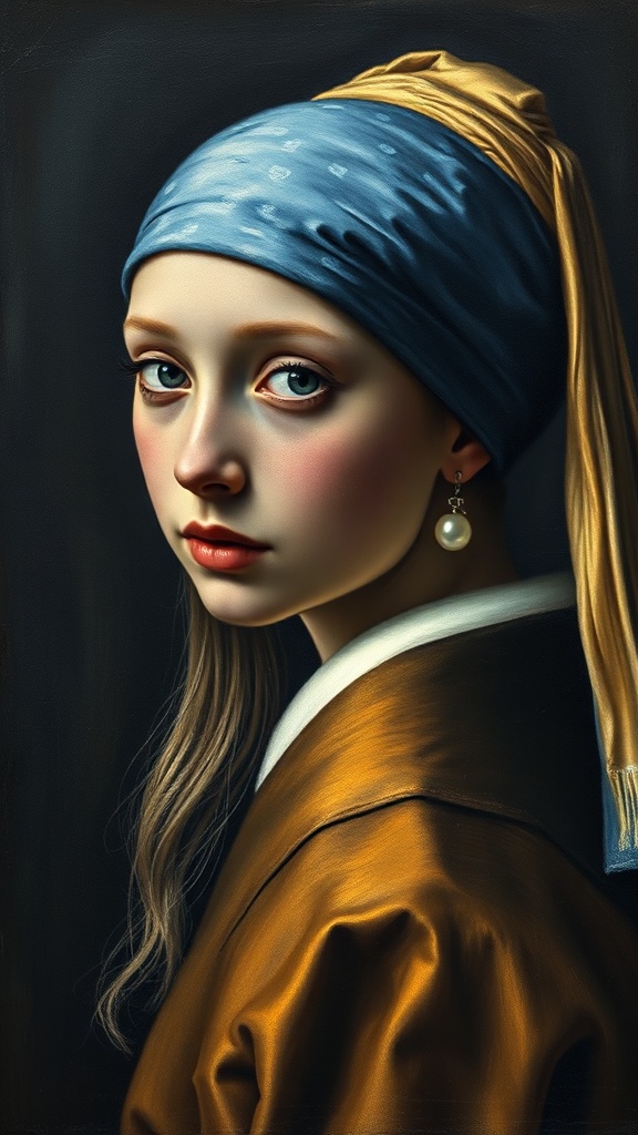 View this AI-generated image featuring a mesmerizing reinterpretation of girl with a pearl earring evolves into a gothic opus featuring a blond haired girl draped in an elegant black headscarf the mood is somber yet enchanting set against a backdrop of a meticulously detailed oil painting that evoke