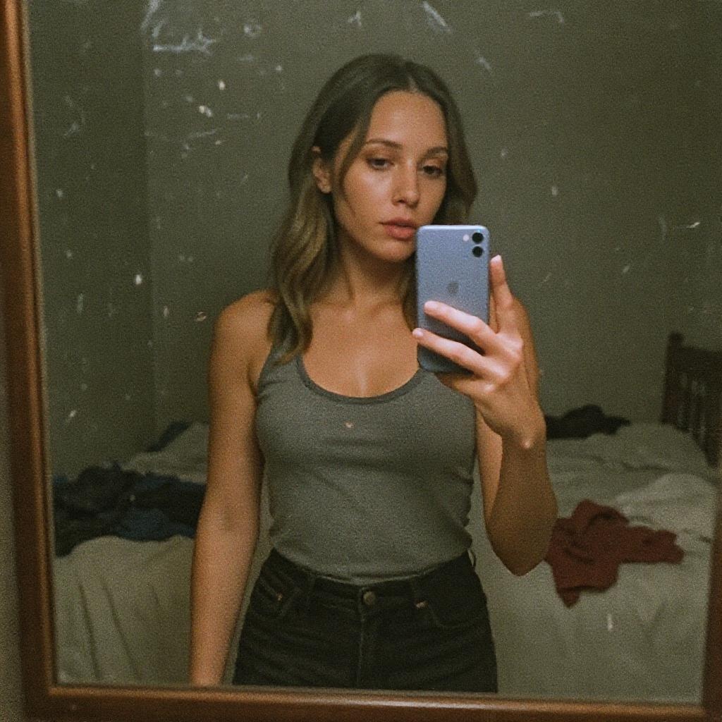A woman reminiscent of Jennifer Love Hewitt stands in front of a mirror, snapping a selfie. The image is noticeably grainy, with a subtle blur that softens the details. Dim lighting casts shadows, partially obscuring her features. The room around her is cluttered, with clothes scattered across an unmade bed. Her expression is relaxed yet focused, while an older smartphone struggles to maintain clarity, capturing the image with an authentic, unpolished feel. The mirror is marked with smudges and fingerprints, enhancing the raw, everyday ambience of the scene.