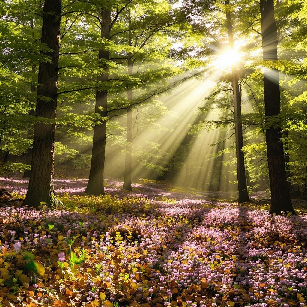 Remove the characters from the scene and transport them to a vibrant, sun-dappled forest setting, where towering trees reach for the sky and a gentle breeze rustles through the leaves. Transform the atmosphere with subtle touches of colorful wildflowers scattered across the forest floor and shafts of sunlight filtering through the canopy, casting playful shadows. Retain the essence of the original scene while infusing the new environment with a sense of serenity and natural wonder.