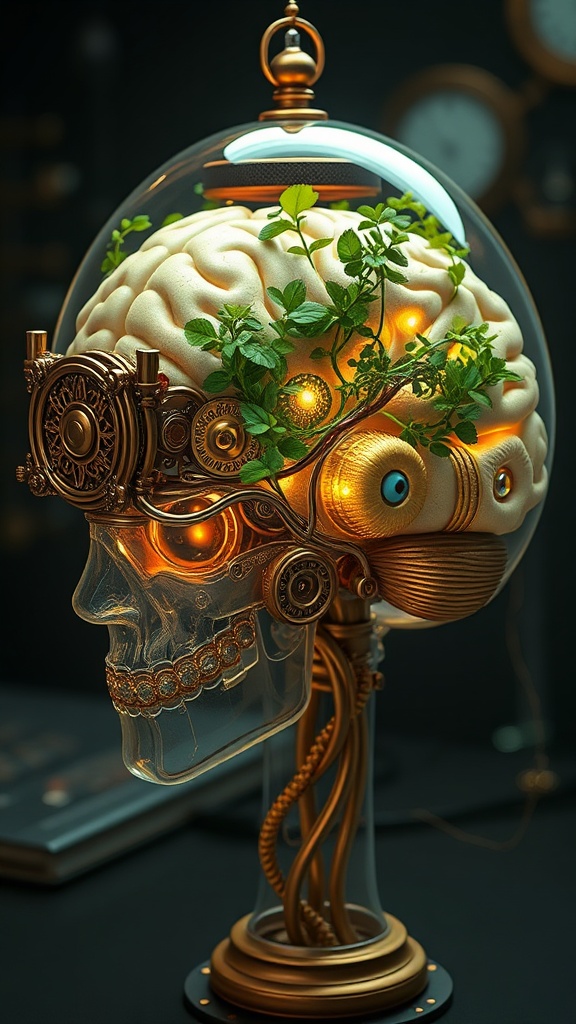 3D render of a sci-fi baroque concept design featuring an anatomically correct brain device integrated with a lush terrarium, infused with steampunk aesthetics. The design showcases intricate details, combining scientific precision with ornate metallic filigree, copper gears, and glass chambers. The scene is hyper-detailed and photorealistic, capturing the essence of a futuristic laboratory where nature meets machine in harmonious complexity. The modification introduces softly glowing neural pathways interwoven with delicate vines, creating a mesmerizing interplay of light and organic forms.