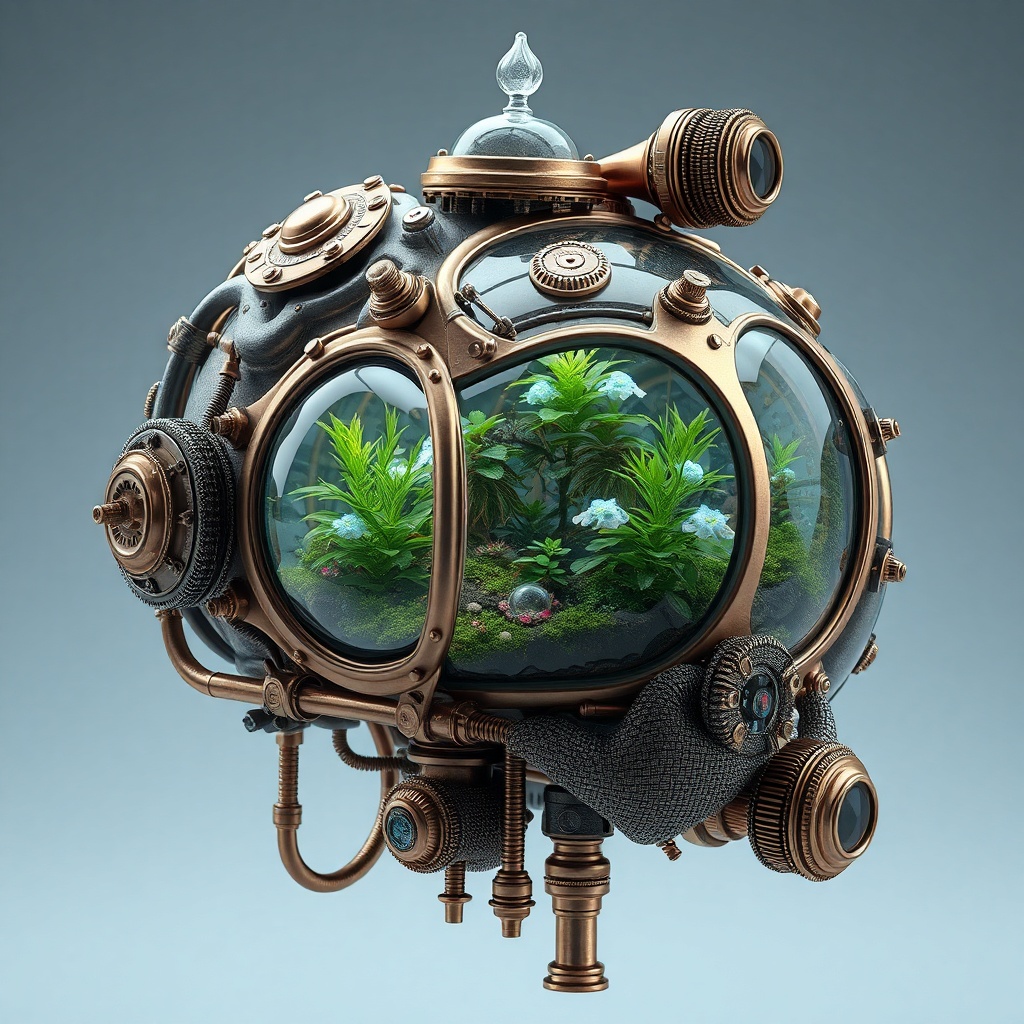 A hyper-detailed 3D render of a sci-fi baroque-inspired brain device featuring steampunk elements and an anatomically correct design with a terrarium at its core. This photorealistic concept showcases intricate details and scientific features, blending metallic gears, ornate embellishments, and glass panels. The terrarium inside is lush with miniature plant life and bioluminescent organisms, casting an ethereal glow. Copper pipes and brass cogs interweave seamlessly with the organic aspects, hinting at a fusion of nature and technology. The overall aesthetic is both elegant and futuristic, embodying an advanced yet classical style.