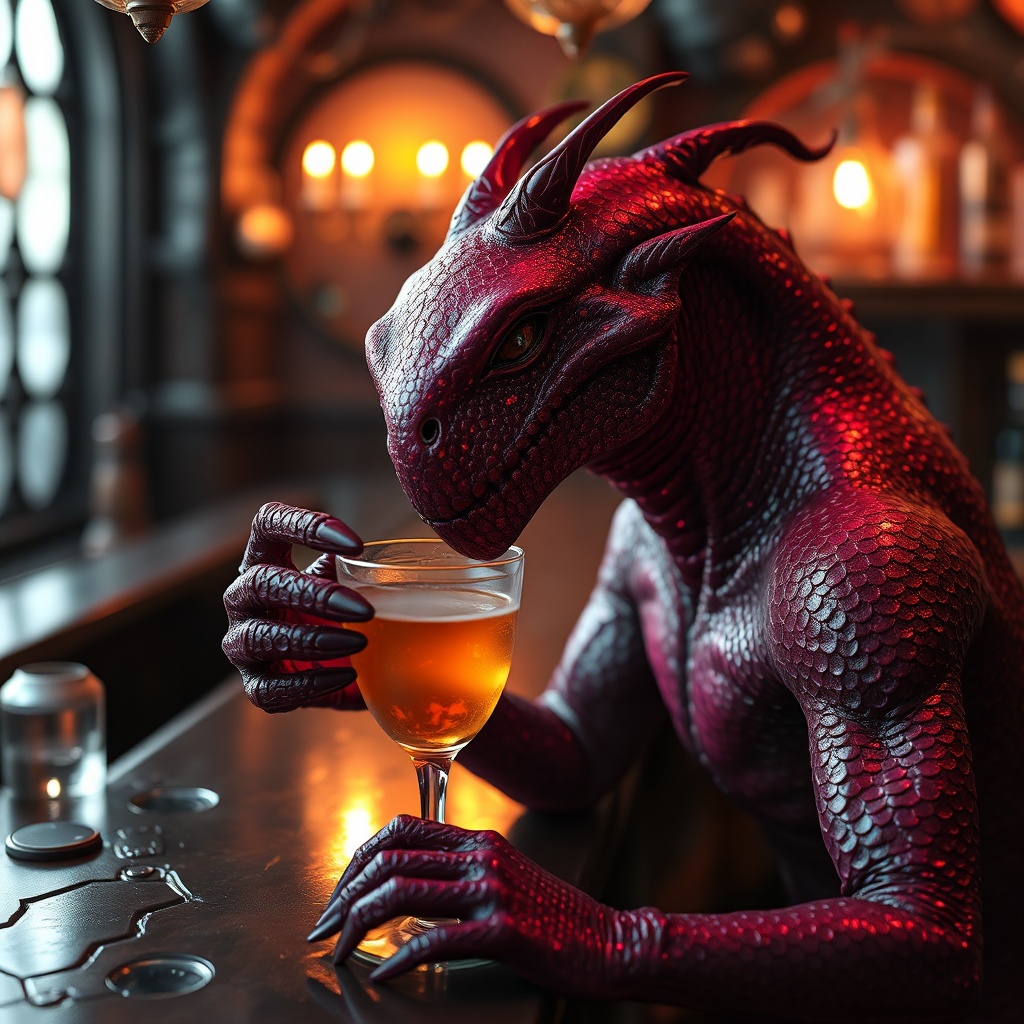 View this AI-generated image featuring a captivating 3d render depicting a garnet hued creature its luminescent scales shimmering as it savors a drink in a steampunk inspired bar the scene is intricately detailed capturing the wet texture of the creature s skin under the soft glow of rim lighting th