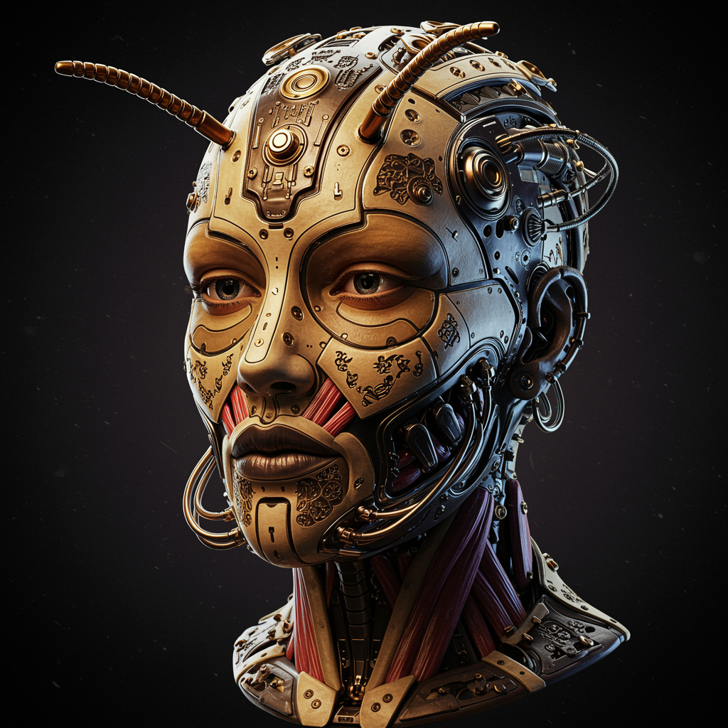 View this AI-generated image featuring a stunning 3d render of an intricately detailed metal bee android face blending cyborg and robotic elements the design showcases a 150 mm scale illuminated by exquisite studio soft lighting with an accentuated rim light the vibrant details emit a luxurious cybe