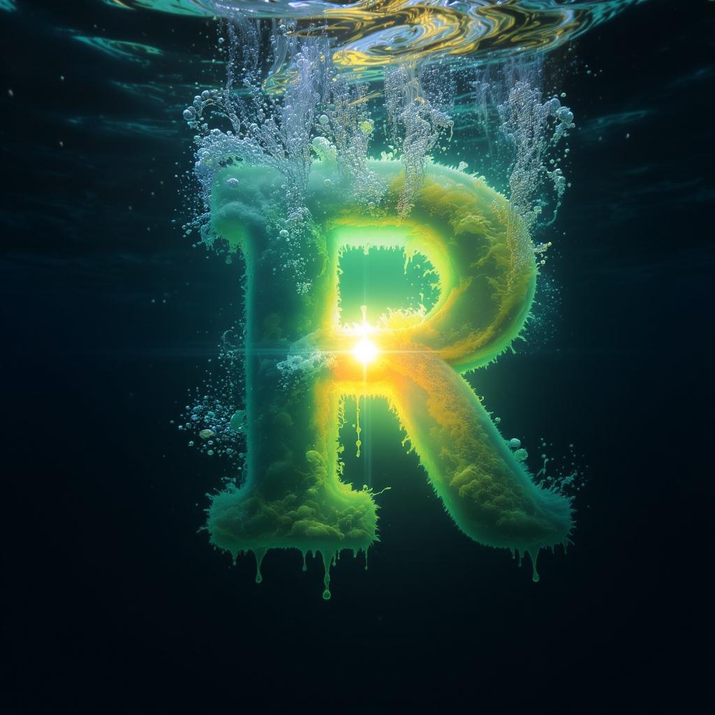 A hyper-realistic 3D render of the letter, enveloped in a harmonious blend of periwinkle and canary yellow hues, set beneath swirling underwater currents. Illuminated by a bright, mystical light emanating from the center, the scene is bathed in high contrast, creating an eerie yet captivating atmosphere. The water surface ripples with liquid effects, showcasing hyper-detailed textures that dramatize the underwater tableau. The dramatic lighting enhances the surreal environment, captured in an 8K resolution, drawing the viewer into this enigmatic underwater world.