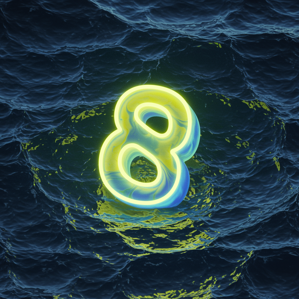 A photorealistic 3D render features a luminous letter rendered in a mesmerizing blend of periwinkle and canary yellow, situated beneath a swirling undercurrent. The vibrant focal point glows brilliantly, creating dramatic high-contrast lighting that casts an eerie yet captivating atmosphere. The hyper-detailed water textures and rippling surfaces are exquisitely captured, highlighting liquid effects with rich nuances. The scene conveys a sense of depth and motion, enhanced by the intricate play of light and shadows across the liquid landscape, rendered gloriously in 8K resolution.