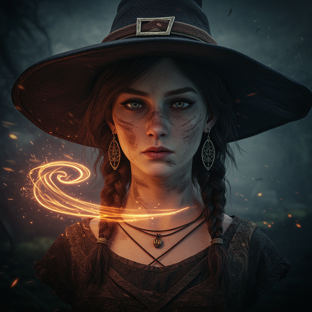 A realistic render of a young female witch with a swirl of magic infusing her, set in a cinematic scene with dramatic lighting. The atmosphere is volumetric, enhancing the magical ambiance. The focus is hyperdetailed, capturing the textures of her dirty face and the intricate design of her earrings. Her expression is intense yet enigmatic, with a long neck adding to her ethereal presence. The image has a slight crop, emphasizing her determined gaze. There are elements of low resolution and visible jpeg artifacts, giving it a raw and unpolished feel. Despite these imperfections, the composition remains captivating and evocative, lacking any visible signatures or watermarks, allowing the viewer to fully immerse in the mysterious world of the young witch.