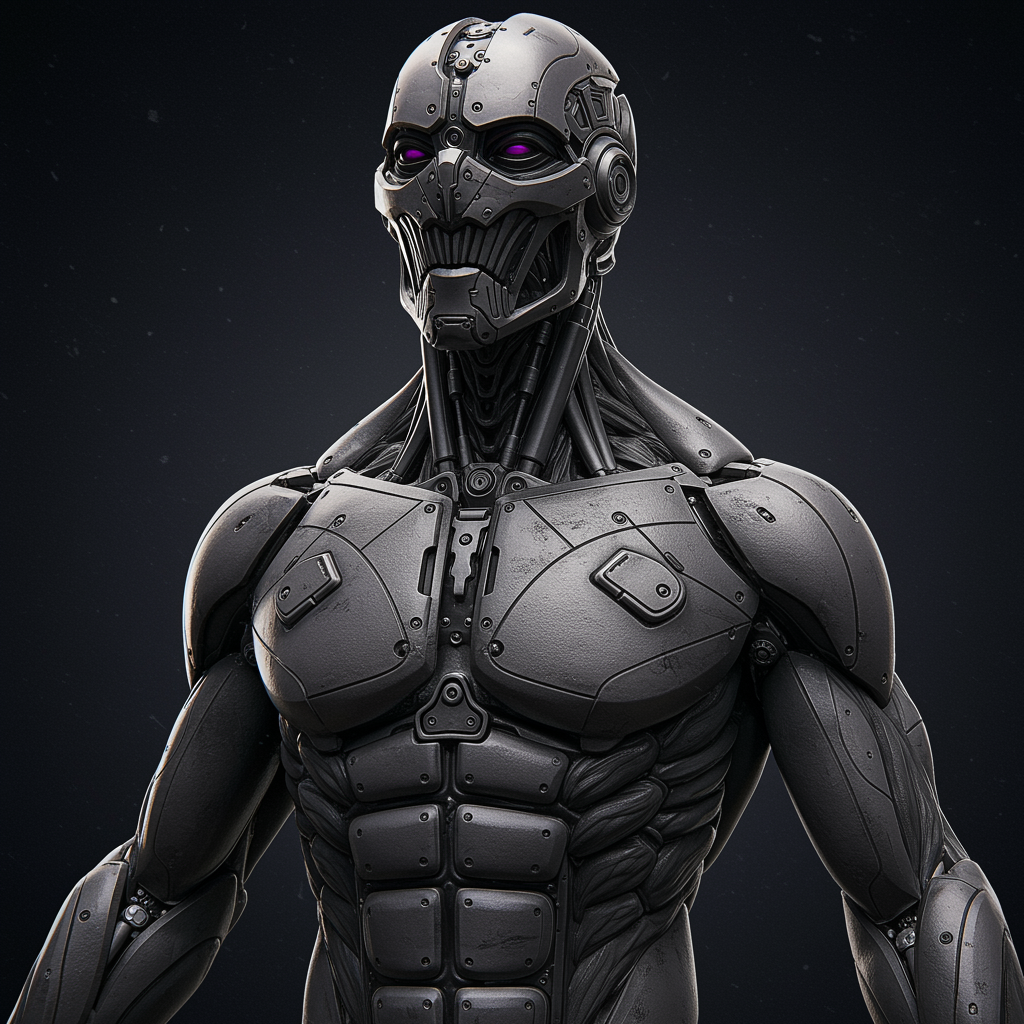 3d render, high-quality, ultra-realistic, exceptionally detailed, half-body shot: enigmatic muscular humanoid villain robot, sleek design, deep metallic tones, complex intricate detailing, lifelike organic textures, enhanced reflective surfaces.