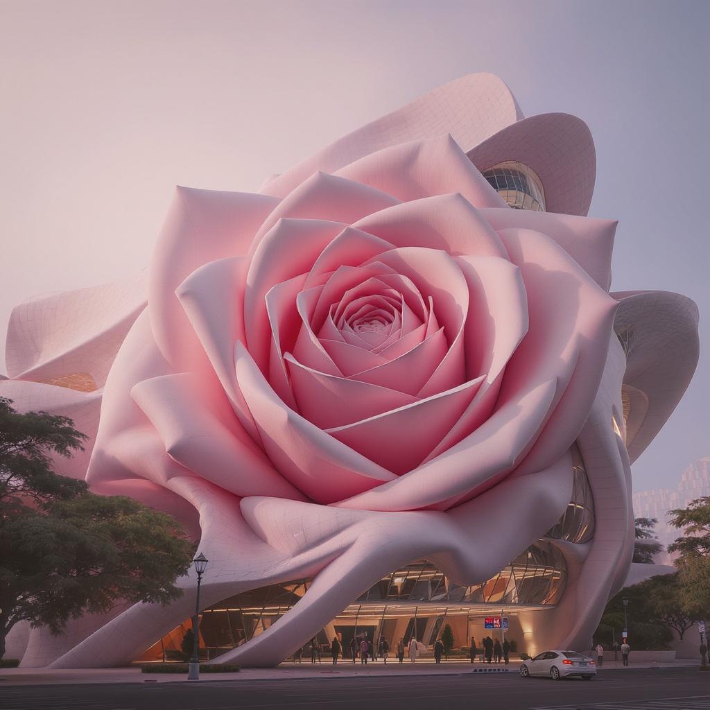 A hyper-realistic 3D rendering of a building exterior, drawing inspiration from the layered structure of a rose flower, evoking the fluid and organic forms associated with Zaha Hadid's design style. The visualization is created using Unreal Engine 5, featuring advanced ray tracing and post-processing techniques, alongside intricate detailing achieved through ZBrush and Substance Painter. The scene is captured with cinematic composition and lighting, adhering to the rule of thirds for visual balance. Set in a lightly fogged, atmospheric environment with natural, low-contrast lighting and subtle volumetric light effects. The rendering employs a blend of corona, octane, and redshift render techniques to achieve an ultra-detailed, 8k resolution finish, akin to a matte painting suitable for movie concept art. A refined blend of hyper-detailing and artistic creativity results in an image that is trending on ArtStation, with a cinematic composition shot through a 35mm lens.