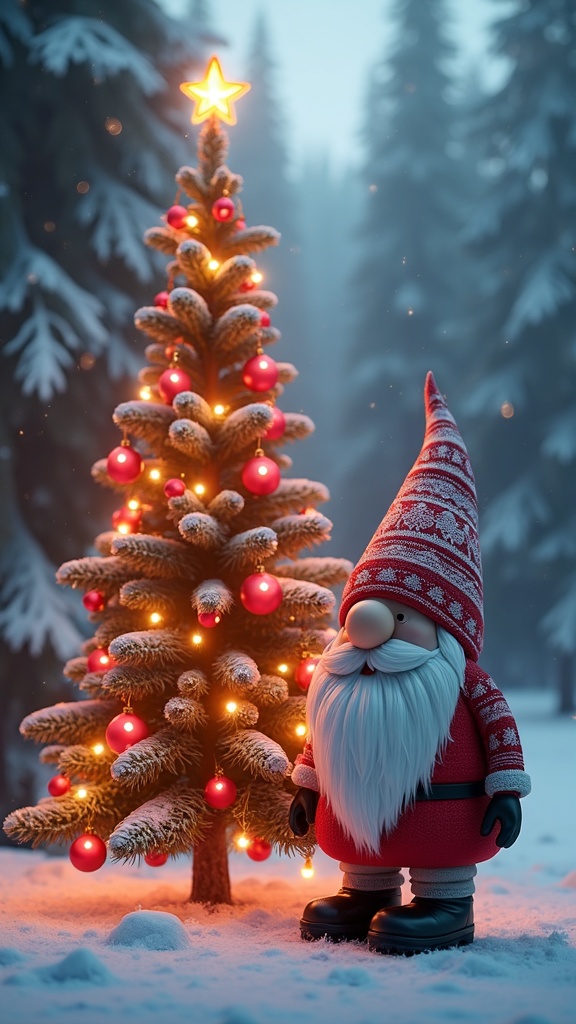 View this AI-generated image featuring a digital rendering of a cgi new year tree adorned with glowing ornaments and vibrant lights beside it stands a scandinavian christmas gnome reimagined in the playful kaws style featuring exaggerated features and bold colors set against a dreamy gradient backgr