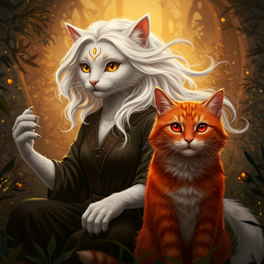 A digital rendering of a female white cat witch with flowing golden-white hair and honey amber eyes reminiscent of the afternoon sun, gracefully enveloped within her mystical realm, alongside her enchanting comrade, a vivid ginger cat with intense red eyes, exuding the fierce energy of a wildfire. Their contrasting yet harmonious monochromatic fur attire highlights their mystical synergy. This high-definition portrait captures intricate fur details with ambient, volumetric lighting that adds depth and dimension, subtly enhancing the ethereal ambiance of their shared domain.