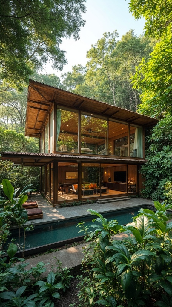 View this AI-generated image featuring a stunning residence designed in a contemporary tropical style nestled within a lush forest surrounded by an abundance of trees and vibrant plant life large glass walls blur the lines between indoor and outdoor spaces allowing sunlight to filter through the can