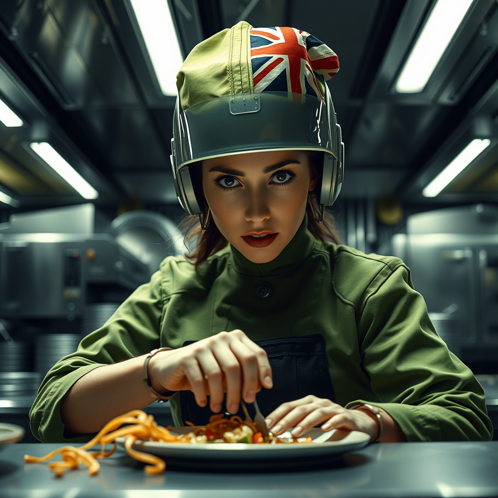 restaurant aggressive female cook intricate detailed formal Chartreuse Earthy green cloth uniform sci-fi futuristic Dieselpunk dramatic cinematic lighting low angle shot dynamic action posture to scale high facial details masterpiece 8k dark realistic fabric details and folds frenzy wide-open eyes raised eyebrow intense facial expression preparing food simple background monochrome low background contrast background noise helmet hard surface flag stars and stripes union jack futuristic kitchen setting with gleaming stainless steel surfaces complex machinery and a bustling atmosphere that reflects a high-paced environment