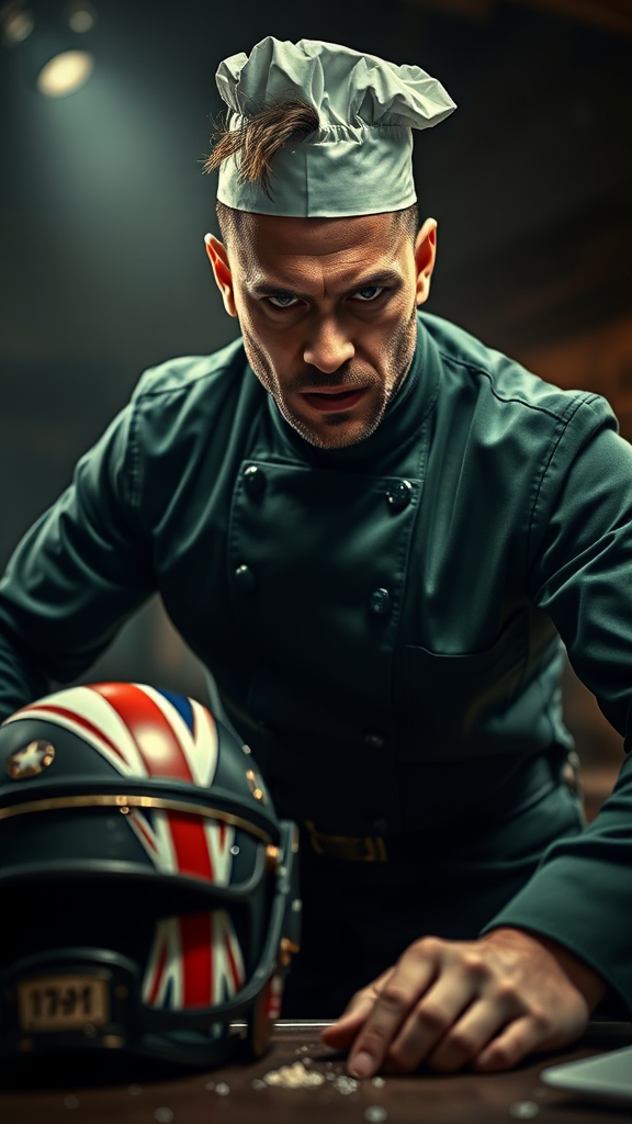 Restaurant energetically intense male chef with brilliantly detailed deep green formal uniform, infused with a Steelpunk aesthetic. Dramatic cinematic lighting captures him from a low angle in a powerful action stance, emphasizing high-resolution facial features with an expression of barely contained fury. His wide-open eyes and raised eyebrow reveal his disdain for the tedious task of food preparation. The background is subtly simple and monochrome, with low contrast and soft noise, enhancing the focus on the chef. A helmet rests beside him, adorned with both the Union Jack and stars and stripes, adding a touch of cultural intrigue. Despite the chaos, the uniform's realistic fabric and folds remain immaculate, creating a masterpiece in 8k resolution. The scene excludes unnecessary distractions, maintaining artistic integrity with a balance of depth and drama.