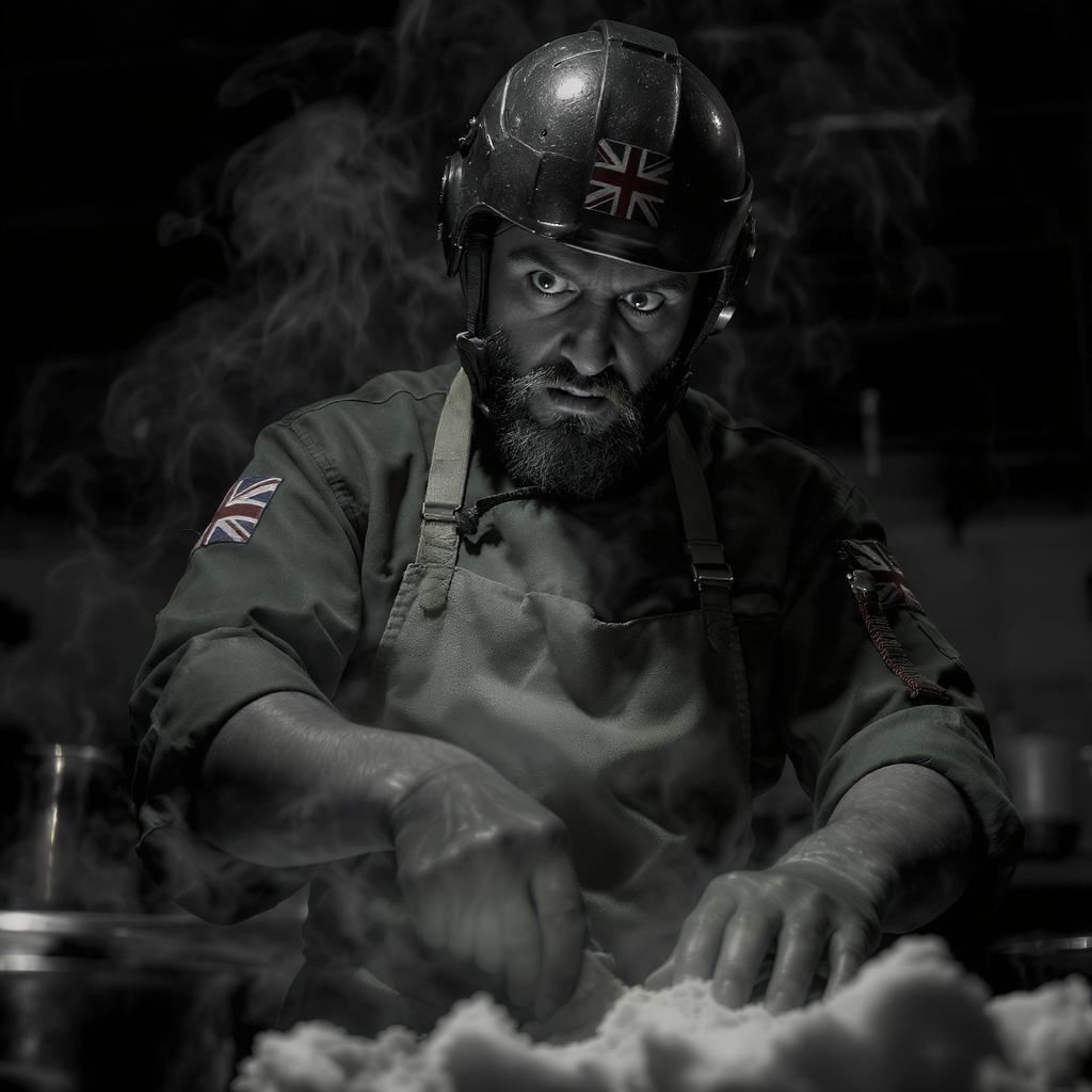 Restaurant, intense male chef with an intricate, highly detailed Forest Cool green cloth uniform, Steelpunk aesthetic, dramatic cinematic lighting, low angle perspective, dynamic action stance, precise facial features, masterpiece quality, 8k resolution, dark atmosphere, realistic fabric textures and folds, frenzied expression, wide-open eyes, arched eyebrow, intense gaze, portraying boredom with food preparation, simplistic background, monochrome palette, subtle background contrast, background noise, wearing a helmet with a hard surface, flag elements like stars and stripes and Union Jack subtly incorporated, focusing on expression and posture, artistic portrayal, uninspired mood conveyed through expression and setting.