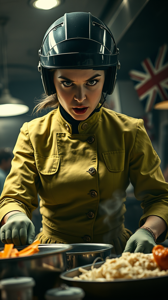 Restaurant scene with an aggressive female cook in an intricate, highly detailed formal Chartreuse earthy green cloth uniform. Inspired by sci-fi and futuristic elements, incorporating Dieselpunk aesthetics. Shot in dramatic cinematic lighting from a low angle, capturing her in a dynamic action posture. The cook features intricate and highest facial details with wide-open eyes, a raised eyebrow, and an angry expression as she prepares food fervently. The scene is a masterpiece rendered in 8k resolution, with realistic fabric details and folds, set in the chaos of a kitchen frenzy. Background is simple and monochrome with low contrast, slight background noise, and subtle nods to hard surfaces. She wears a helmet, and flags like the stars and stripes and the union jack make subtle appearances. The emphasis is on her powerful presence and skill, conveyed with suggestive artistic flair.