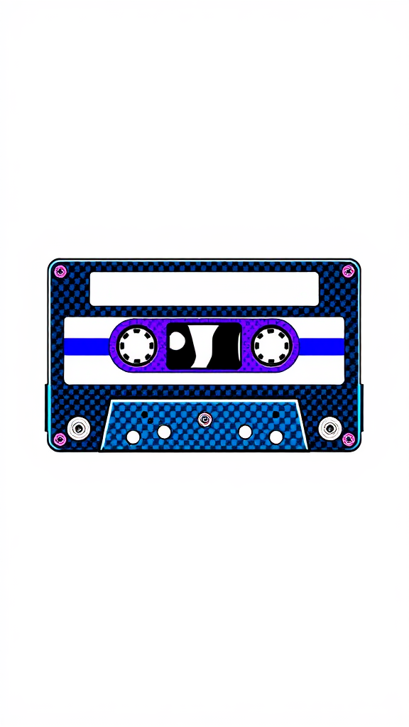 Retro cassette tape icon with a carbon fiber texture, infused with a vibrant blue and purple color palette, in a style reminiscent of Roy Lichtenstein's pop art, set against a clean white background, featuring bold outlines and dynamic expressions.