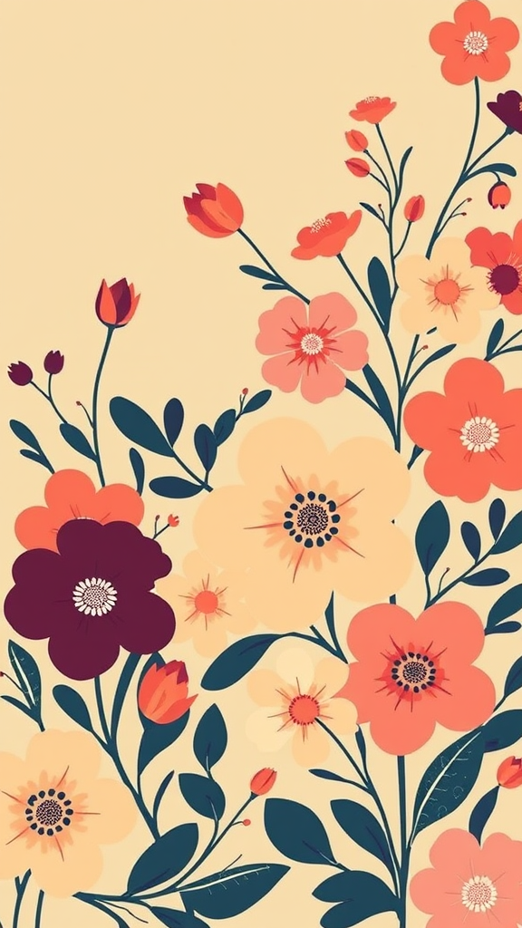 Retro floral design with a harmonious multi-color palette, featuring simple yet elegant patterns, capturing a vintage aesthetic with a focus on vibrant hues, styled in an elongated aspect ratio for a unique visual appeal.