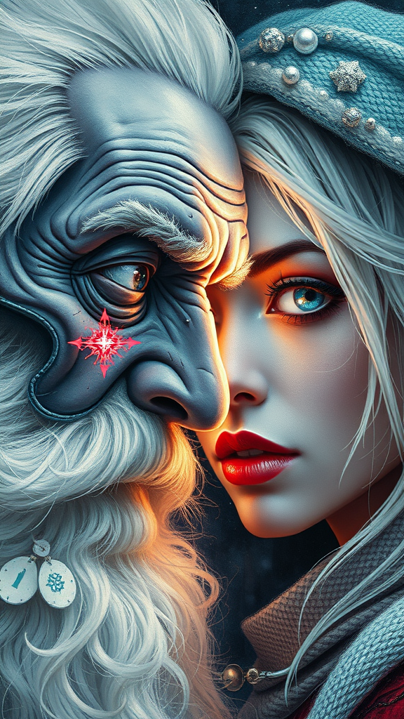 Retro-Futuristic Art Nouveau and Cyberpunk-inspired digital painting featuring a double exposure of a cyberdemonic old male with white hair resembling Santa and a Snow Maiden woman. They are depicted close together in a dynamic portrait that highlights a detailed demon face with light and shadow play. The painting incorporates elements of James Jean, Craola, Andy Kehoe, Dorian Vallejo, Damian Lechoszest, and Todd Lockwood, with hints of stained glass and storybook illustration. It emphasizes unusual, beautiful, and intricate details, with a close-up view that showcases a perfect and sharply glowing eye under an intricate lighting scheme. The artwork is vivid and features a dynamic pose, splatter effects, and uses acrylics for a rich texture on a cracked paper background.