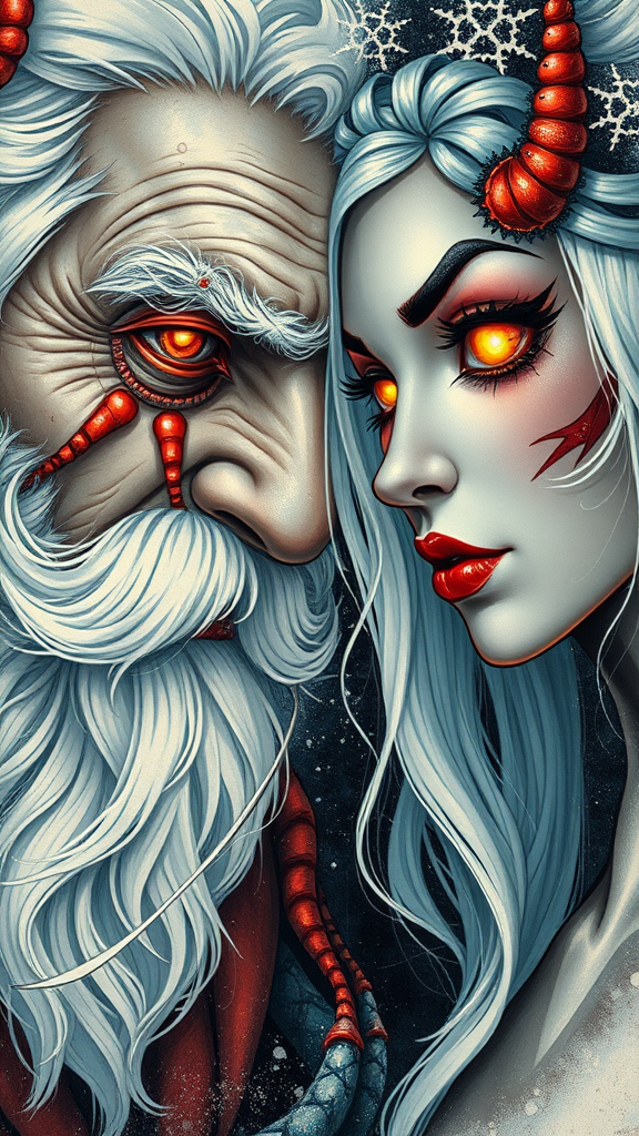 Retro-Futuristic, Art Nouveau, Cyberpunk, double exposure, detailed splatter digital painting with line art and acrylic on cracked paper. Cyberdemonic old male white-haired Santa and Snow maiden woman in a close portrait, featuring a detailed demon face with dynamic poses and intricate light and shadow play. Their faces are perfect, with sharp, glowing eyes, in the style of James Jean, Craola, Andy Kehoe, Dorian Vallejo, Damian Lechoszest, Todd Lockwood, DamShelma. Incorporating elements of stained glass and storybook illustration, the piece is a masterpiece of unusual and beautiful details, with intricate lighting and luminism. The characters have long necks, portraying a fusion of retro and futuristic aesthetics, without distortion or disfigurement, maintaining a focus on high-quality and detailed composition. The image emphasizes dynamic and artistic expression, with a harmonious blend of unique styles, avoiding the pitfalls of poor anatomy or cluttered composition.