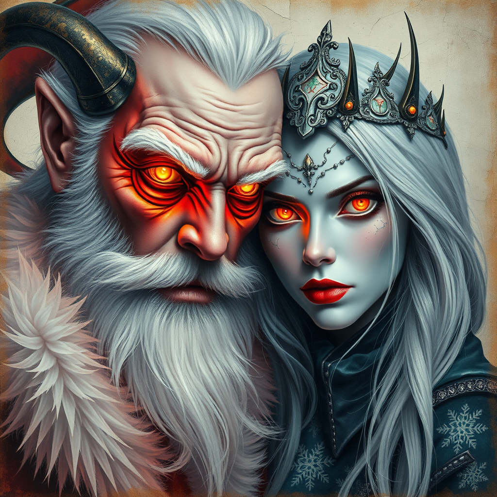 Retro-Futuristic Art Nouveau Cyberpunk double exposure painting featuring a cyberdemonic old male white-haired Santa and a Snow Maiden woman together in a portrait. Detailed demon face with dynamic lighting, showcasing shadow play on their perfect faces and sharp, glowing eyes. Inspired by the styles of James Jean, Craola, Andy Kehoe, Dorian Vallejo, and others. The painting should incorporate stained glass effects with storybook illustration aesthetics, focusing on unusual beautiful details and intricate lighting. Elements include acrylic splatter, line art, and a dynamic pose on a cracked paper background, capturing a highly detailed and high-quality composition with a touch of luminism. Emphasize the elegance and unique aspects without adding any distortions or unnecessary elements such as extra faces or limbs.