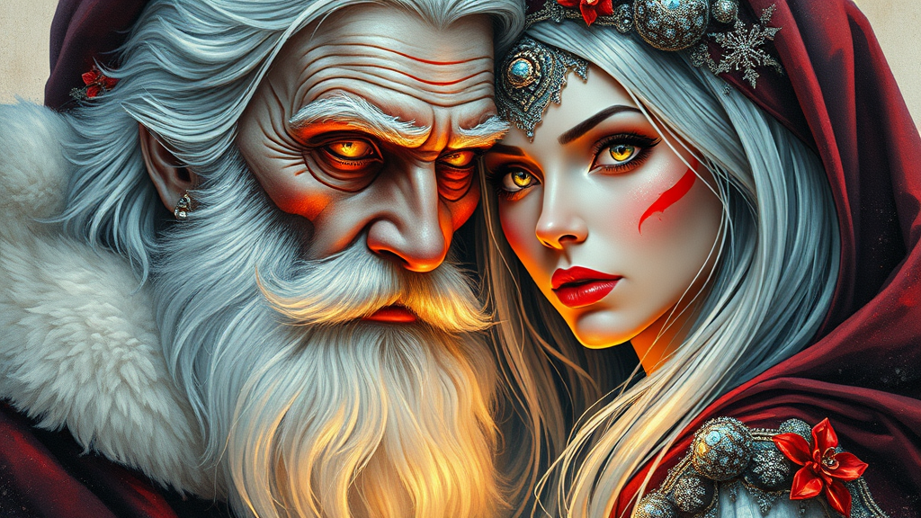 Retro-Futuristic Art Nouveau Cyberpunk double exposure portrait of a cyberdemonic elder male with white hair as Santa and a Snow Maiden woman, close together. Their dynamic pose features intricate light and shadow play on detailed faces, with sharp glowing eyes evocative of luminosity. Rendered in a detailed splatter digital painting on cracked paper, this masterpiece echoes the styles of James Jean, Craola, Andy Kehoe, Dorian Vallejo, and Damian Lechoszest. The image features stained glass storybook illustration elements with unusual and beautiful details. Tiny, intricate details highlight the art's quality, with a focus on brilliant lighting. The characters display long necks and possess an air of mysterious elegance, staying true to the core concept while employing a mix of retro-futuristic and elegant motifs.
