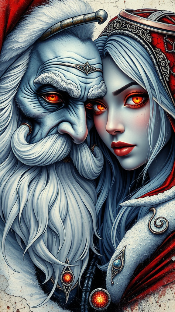 Retro-futuristic Art Nouveau cyberpunk double exposure with cyberdemonic old male white-haired Santa and Snow Maiden woman close together, featuring dynamic detailed splatter digital painting and intricate line art, acrylic elements on cracked paper. Their portrait showcases a detailed demon face with dynamic pose, light and shadow play across perfect, sharply glowing eyes. The style echoes influences from artists like James Jean, Craola, Andy Kehoe, Dorian Vallejo, Damian Lechoszest, and Todd Lockwood, incorporating stained glass effects and storybook illustration vibes. The artwork includes unusual beautiful details, masterful intricacies, and high-quality luminism, focusing on elongated necks and captivating facial expressions, avoiding any distortions or inconsistencies.