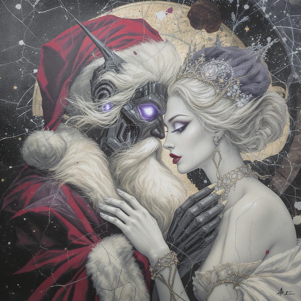 Retro-futuristic Art Nouveau Cyberpunk double exposure painting featuring a cyberdemonic old male Santa with white hair and a Snow Maiden woman. They are portrayed in a dynamic close pose on cracked paper, with details showing a demon face and light and shadow play on perfect, sharp, glowing eyes. The style draws inspiration from artists like James Jean, Craola, Andy Kehoe, and Dorian Vallejo, incorporating intricate details and luminism. The composition includes stained glass and storybook illustration elements, featuring unusual and beautiful intricacies with high-quality lighting. The figures are designed with elongated features and intricate storybook aesthetics, creating a masterpiece with detailed splatter and line art. The artwork excludes elements like extra limbs, distorted anatomy, or blurred features, maintaining clarity and focus on the main subjects.