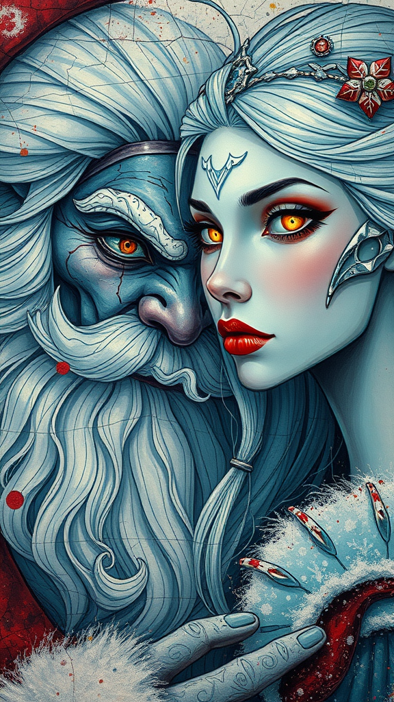 Retro-futuristic Art Nouveau meets Cyberpunk in a double exposure digital painting. The scene is vibrant with splattered paint on a cracked paper canvas, capturing a close-up of a cyberdemonic, white-haired Santa and a graceful Snow Maiden. Their poses are dynamic, bathed in dramatic light and shadow, highlighting Santa’s detailed demonic features and the Snow Maiden's perfect face with sharp, glowing eyes. The composition features intricate line art and acrylic textures, channeling the styles of James Jean, Craola, and Andy Kehoe. It incorporates stained glass and storybook illustration elements, with unusual but beautiful details. The focus is on the mastery of lighting, luminism, and fine details. The Snow Maiden's long neck adds elegance, while the creative portrayal introduces intriguing details without distorting realism. The scene exudes high quality and creativity, avoiding any blurriness, poor anatomy, or unwanted elements, resulting in a cohesive and visually striking masterpiece.