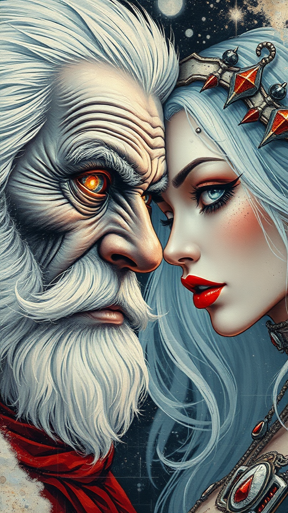 Retro-futuristic Art Nouveau meets Cyberpunk in a double exposure style, showcasing a detailed splatter digital painting with line art and acrylic elements on cracked paper. Featuring a close-up of a cyberdemonic old male with white hair resembling Santa and a Snow Maiden woman, both in a dynamic pose. Their faces display intricate details with sharp, glowing eyes and playful light and shadow contrasts. The art is infused with the style of artists like James Jean, Craola, and Andy Kehoe, with stained glass and storybook illustration vibes. The work is richly detailed, showcasing a masterpiece of tiny, beautiful intricacies, dynamic lighting, and a touch of luminism. Faces are perfect, elongated necks emphasized, while blending unusual elements and sculptural aspects. The scene is a mesmerizing blend of the fantastical and the futuristic, inspiring awe and curiosity.