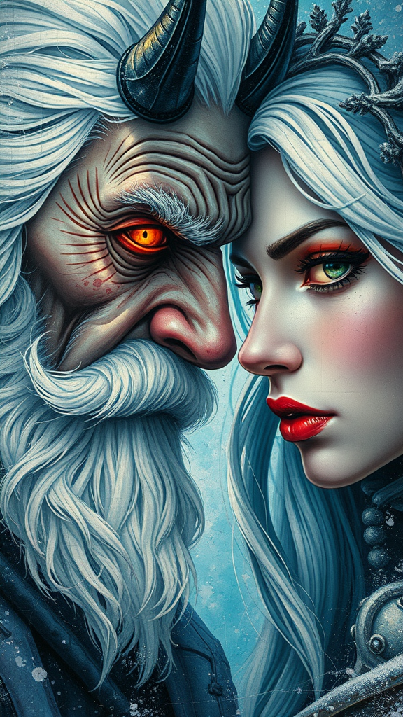 Retro-futuristic art with a blend of Art Nouveau and Cyberpunk, featuring double exposure effects. A dynamic digital painting with detailed splatter, line art, and acrylic texture on a cracked paper texture. The composition includes a cyberdemonic old male with white hair reminiscent of Santa and a Snow Maiden woman, both in a close, engaging portrait. The piece highlights intricate demon features, dynamic poses, and a captivating play of light and shadow across perfect faces, with sharp, glowing eyes. Inspired by artists like James Jean, Craola, Andy Kehoe, and Dorian Vallejo, it displays storybook illustration qualities with stained glass aesthetics. The painting includes unusual, beautiful details and luminism, emphasizing elongated necks, vivid expressions, and masterful tiny details for a high-quality masterpiece. It embraces the retro and futuristic theme while avoiding poor quality features, maintaining artistic integrity with creative flair.