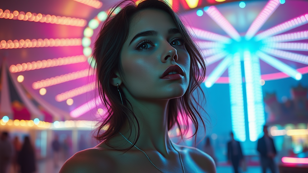 Retro-futuristic portrait of a woman at a celestial circus, ultra-realistic, octane render, vivid CGI, cinematic photography, nostalgic color palette, ProPhoto RGB, dreamlike engine, classic photo aesthetic, 35mm film grain, neon accents, ethereal atmosphere.
