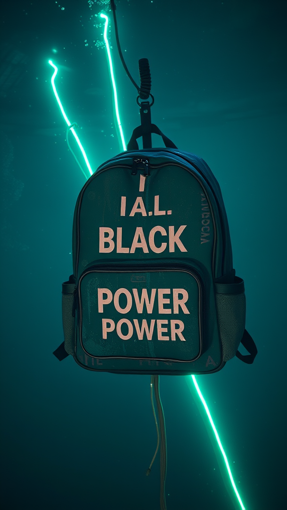 Retro-futuristic underwater photography of a distressed Black Power-inspired backpack design by Jean-Michel Basquiat, on a dark blue-green neon divining rod background, rendered in 8K, high-contrast texture with subtle glitch art elements, aspect ratio 5:4, low key, mysterious and dreamlike atmosphere.