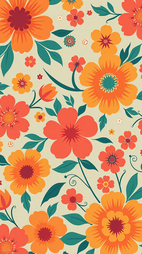 Retro-inspired floral design with an array of vivid colors, featuring a minimalist pattern that evokes a sense of nostalgia and charm, capturing a 2:3 aspect ratio with enhanced detail and vibrant simplicity.