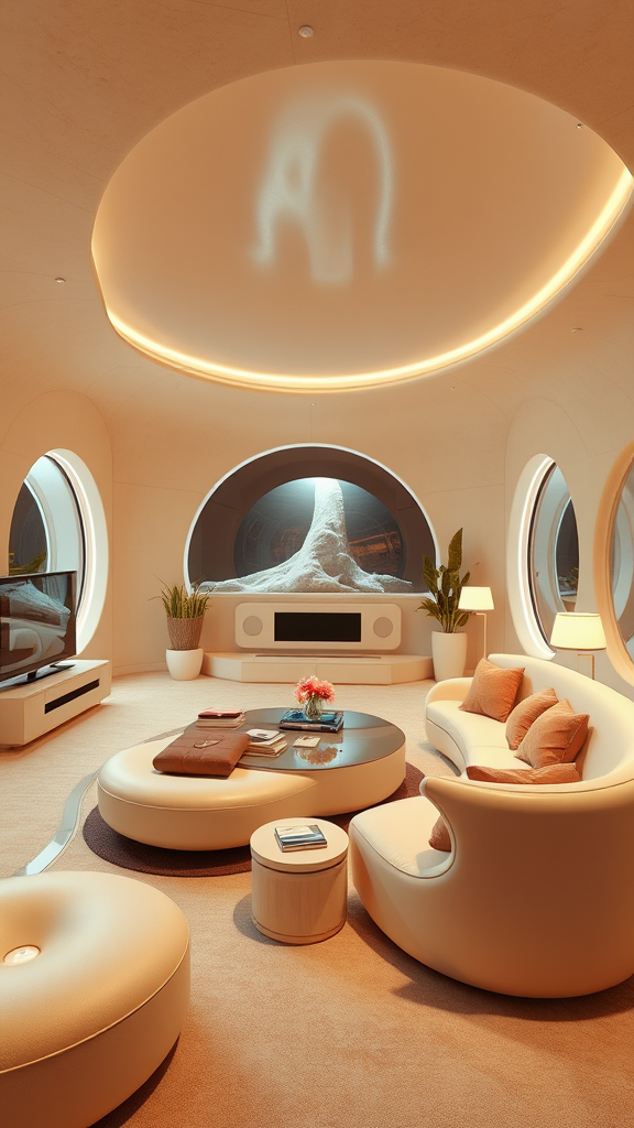 Retro-inspired sunken living room with 70s conversation pit, futurism-infused interior design, whimsical imaginary 3D render in high definition, soothing beige and cream color palette, curved lines and organic shapes, lush textures and reflective surfaces, softly glowing lighting elements, playful ambiance with a touch of nostalgia.