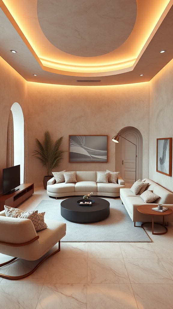 Retro-inspired sunken living room with a cozy conversation pit, 70s nostalgia meets sleek retrofuturism, interior design showcasing an imaginary 3D dreamy ambiance, rendered in ultra-high-definition 8k using Blender, featuring a soothing neutral beige color palette with subtle creative twists to enhance warmth and intimacy.