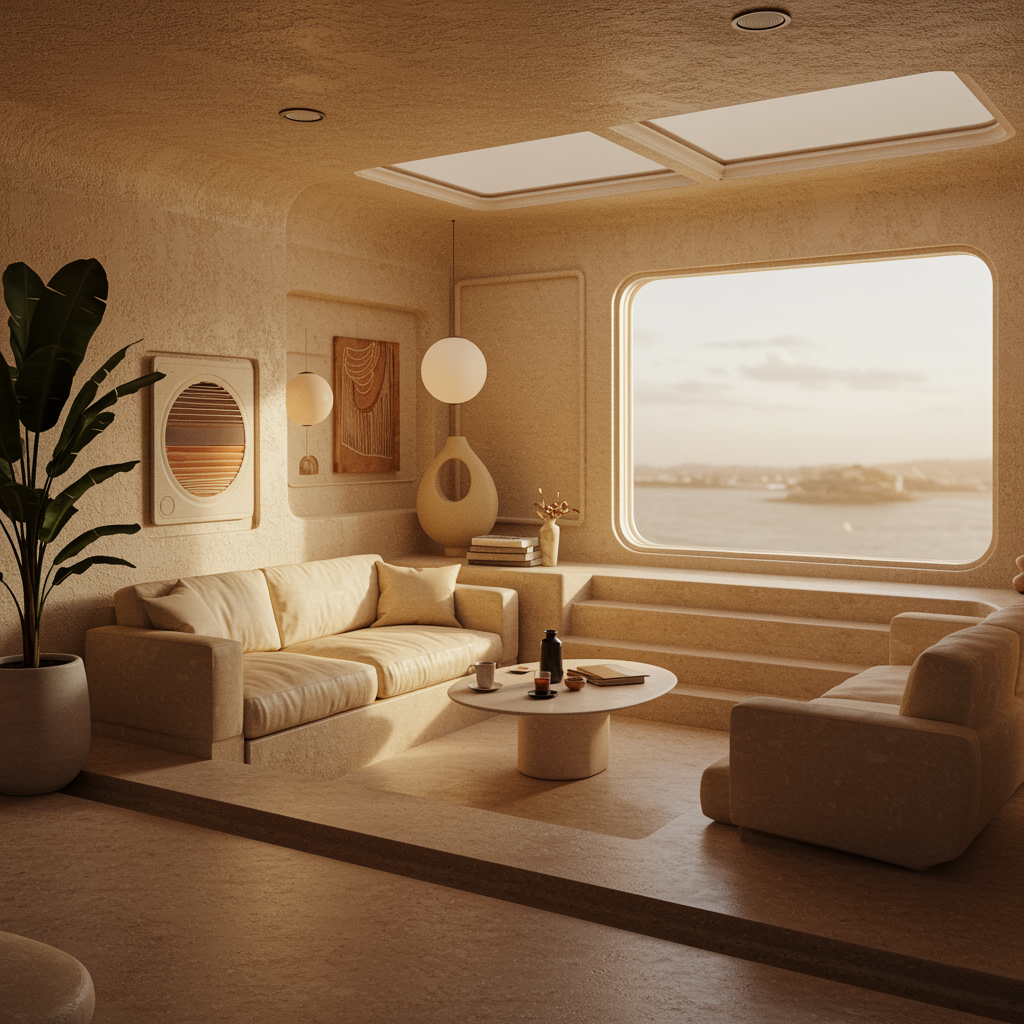 Retro-inspired sunken living space with conversation pit, capturing the essence of 1970s retrofuturism; a dreamy interior design rendered in stunning 8k using advanced 3D architecture, featuring a soothing neutral beige color palette and unique textures, evoking a cozy yet futuristic atmosphere.