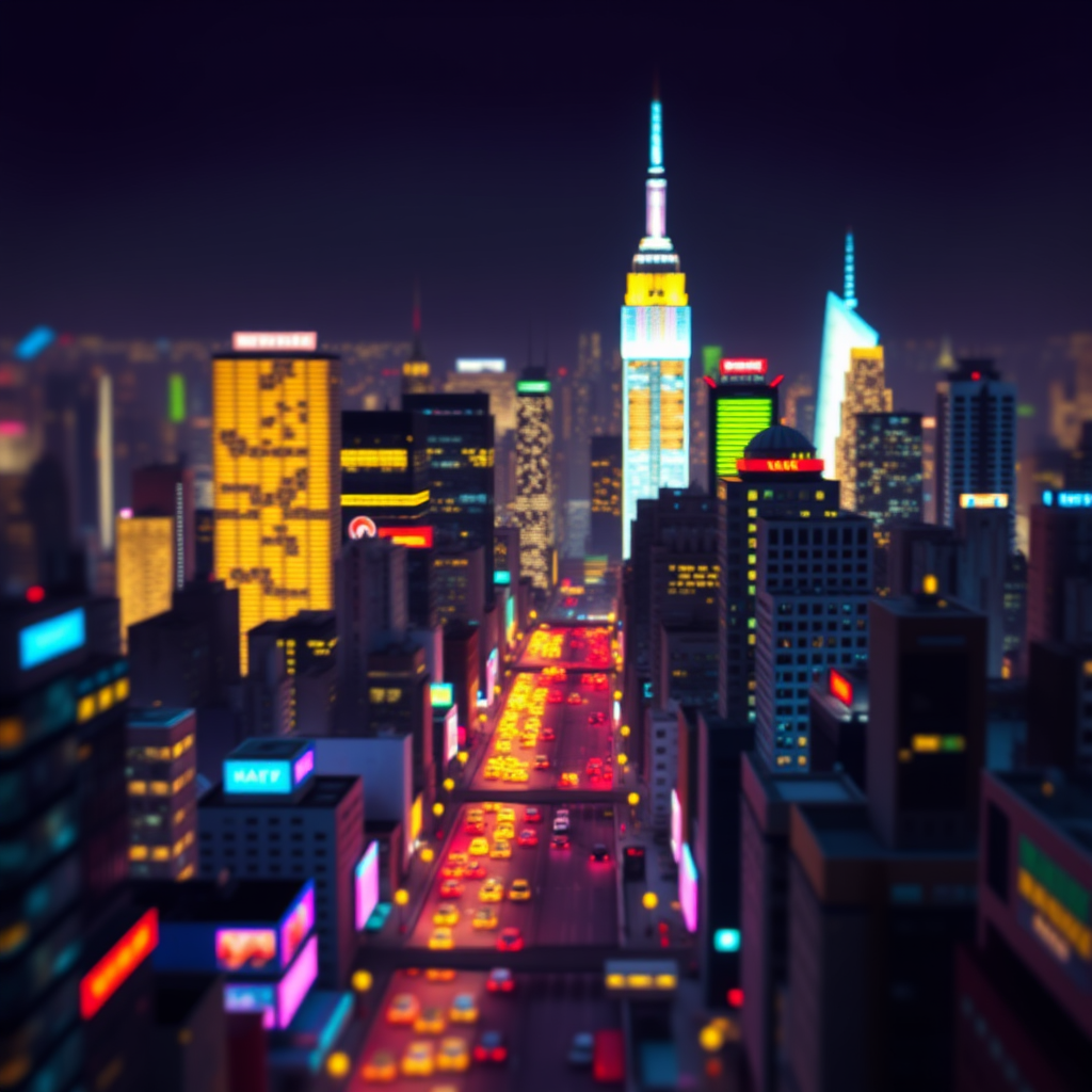 Retro pixel art, miniature cityscape, colorful New York skyline, blurred edges, vibrant lights, tiny bustling streets, vintage digital style.