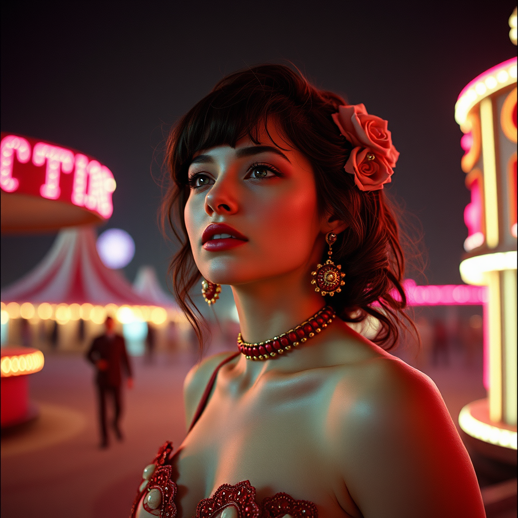 Retrofuturistic depiction of a woman at the global circus, hyperrealism with octane texture, cinematic CGI style, vintage-inspired photography, nostalgic color scheme, ProPhoto RGB integration, dreamlike engine, aged photograph aesthetics, captured on classic 35mm film.