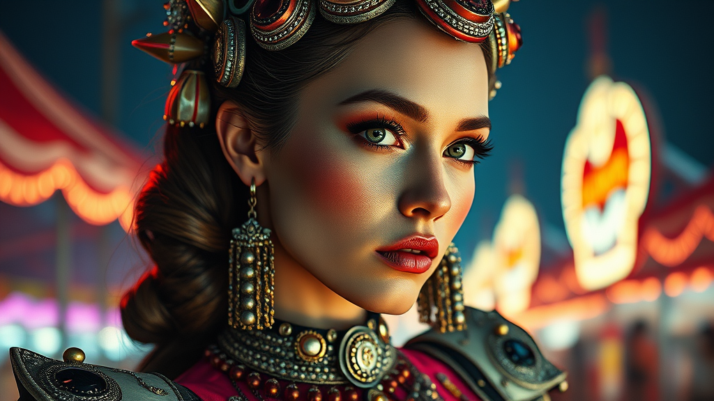 Retrofuturistic portrait of a woman at the global circus, ultra-realistic, octane render, vivid CGI, cinematic photography, nostalgic color palette, ProPhoto RGB, surreal engine, classic photo vibe, 35mm film feel, captivating expression, intricate costume with futuristic embellishments, dynamic lighting, blending past and future aesthetics.