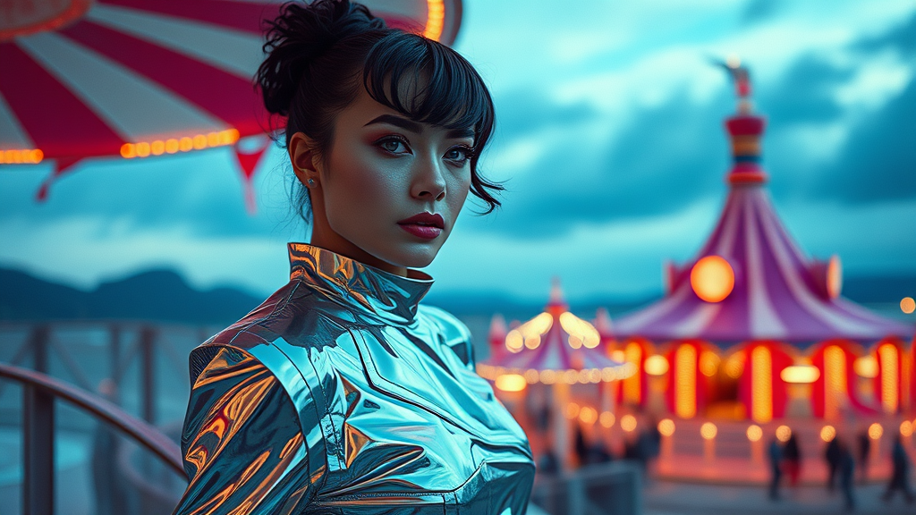 Retrofuturistic portrait of a woman at the global circus, hyperrealistic, octane-rendered CGI, infused with ProPhoto RGB, surreal imagination powered by 35mm ultra HD realism. Capturing the essence of a Marc Jacobs fashion editorial, this image features futuristic attire set against a surreal landscape. The woman, embodying timeless beauty, poses gracefully in a shimmering chrome outfit reminiscent of 90s fashion. Shot on medium format with the vibrant hues of Fuji Superia 400 film, ISO 400, this cinematic and surrealistic scene is rendered in stunning 8k, exuding both elegance and avant-garde charm.