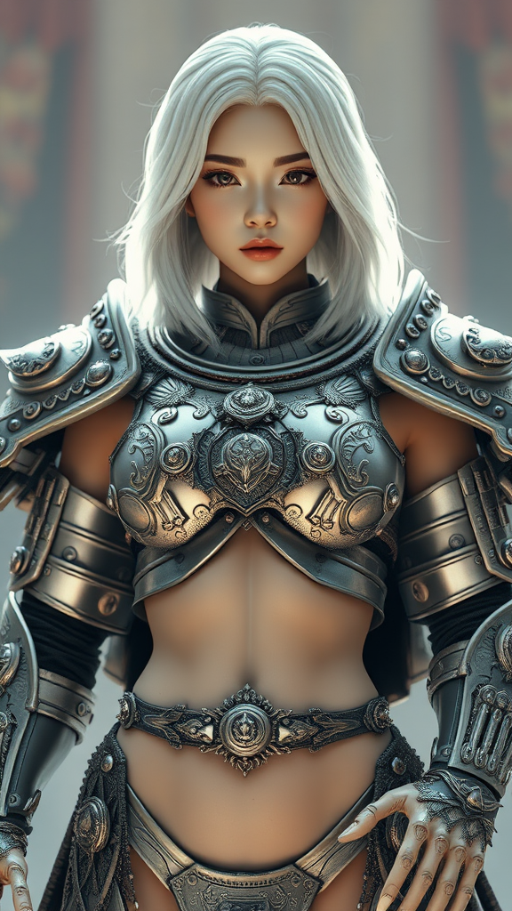 Revealing intricate armor, stunning young Asian woman, full body, radiant olive skin, shoulder-length white hair, defined abdomen, delicate figure, hyperrealism, cinematic lighting, exceptionally detailed, awe-inspiring, photographic quality, mesmerizing setting, wide-angle CGI, 3D, doll-like elegance, octane render, ethereal atmosphere, surreal anatomy, soft focus, dreamlike, surreal limbs, unusual features, abstract hands, non-uniform patterns, artistic distortion, imaginative modifications.