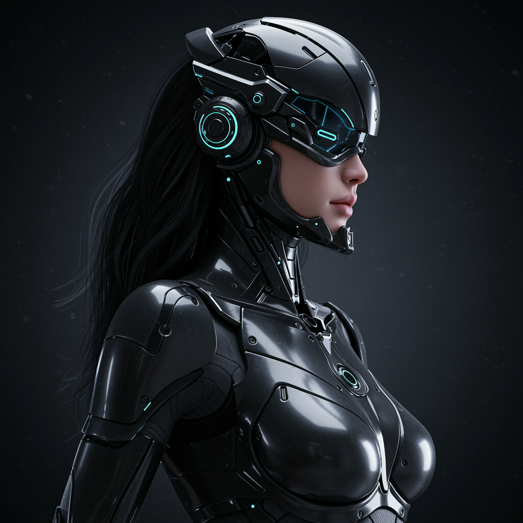 View this AI-generated image featuring rfktr_technotrex sleek and powerful female cyborg with lustrous dark armor form fitting bodysuit accented by intricate mechanical designs flowing black hair cascading over her shoulders advanced headgear integrated with a high tech facial visor futuristic body