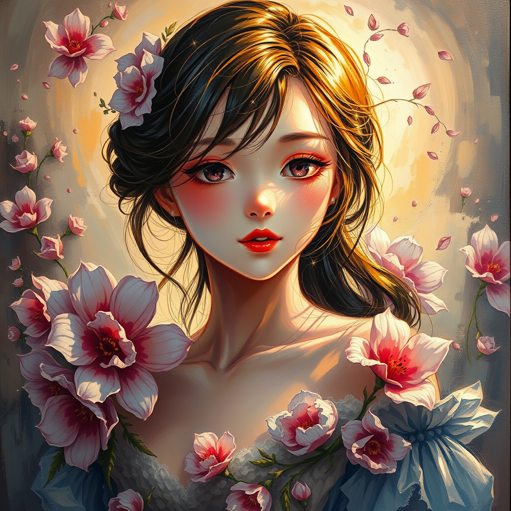 Rich oil painting of a beautiful anime girl, enveloped in thick acrylic strokes, adorned with delicate floral motifs, exhibiting extreme iridescent reflections. Her figure is gracefully illuminated by holy cinematic rim lighting, showcasing a chiaroscuro effect reminiscent of rococo art style.