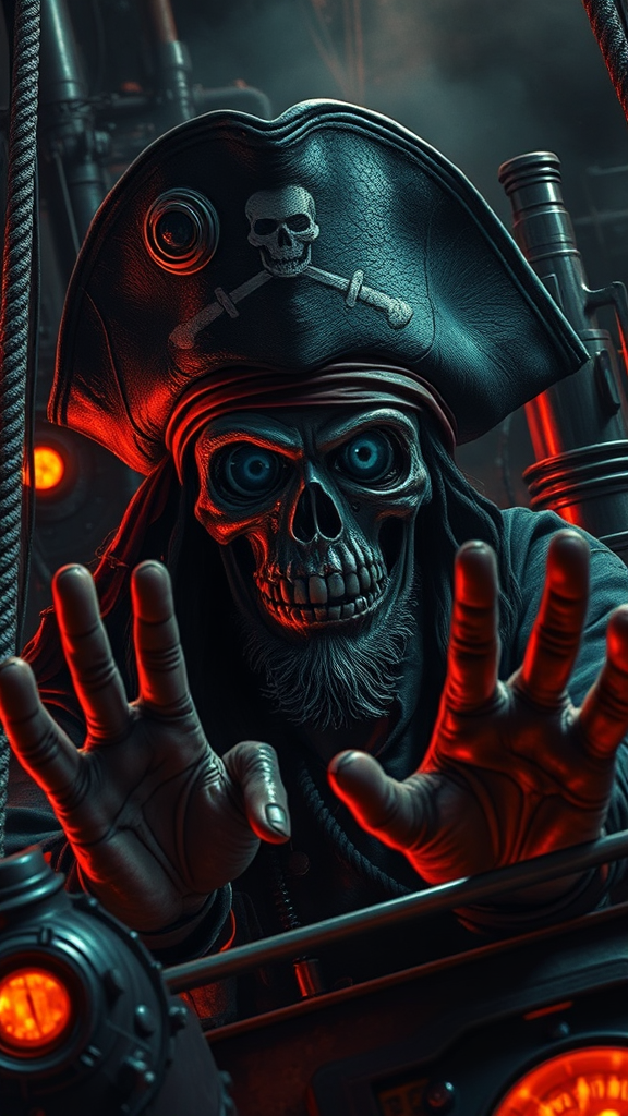 Richard Corben-inspired space pirate aboard a steampunk ship, sporting a Jolly Roger hat, surrounded by dramatic lighting and intense cinematic composition. The scene features extreme detail and gloomy illumination in a 16k UHD HDR setting. The pirate has deformed irises and pupils, giving a unique cross-eyed appearance, with a cloned face that adds to the intensity. Hands exhibit mutations with extra fingers, enhancing the character's otherworldly presence. The atmosphere reflects the gritty ambiance of a space adventure, emphasizing the high-stakes and thrill of piracy among the stars, all while avoiding common digital flaws like cropping, low resolution, or unwelcome text and watermarks.