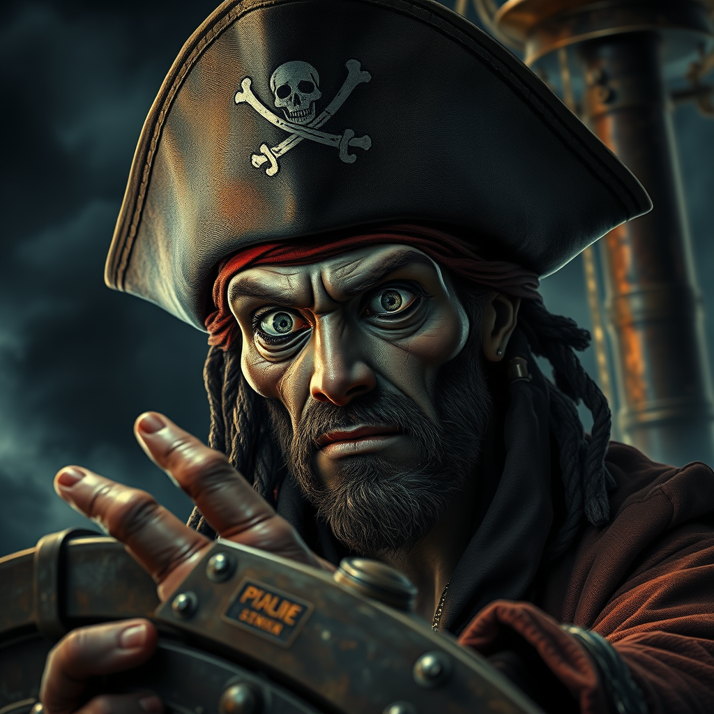 Richard Corben-inspired space pirate with a jolly roger hat, navigating a steampunk ship under dramatic and gloomy illumination. The scene captures intense, cinematic composition with extreme detail in 16k UHD HDR. The pirate's features are slightly off-kilter with deformed irises and pupils, giving an unsettling appearance with cross-eyed focus. Their face shows a hint of cloning, hands appearing mutated with extra fingers, enhancing the character's otherworldly essence. The atmospheric backdrop is rich in detail, evoking a sense of adventurous peril with no distracting elements like signatures or watermarks. The pirate's visage, although set against a cinematic panorama, remains the central focus, drawing viewers into a mysterious, uncanny universe infused with the daring allure of space piracy.